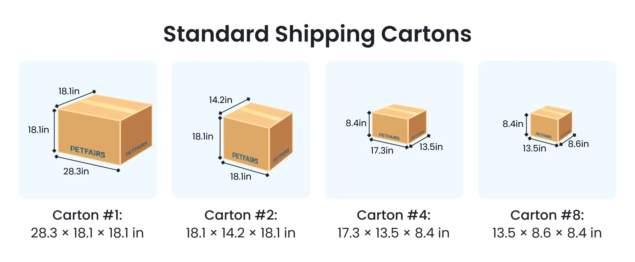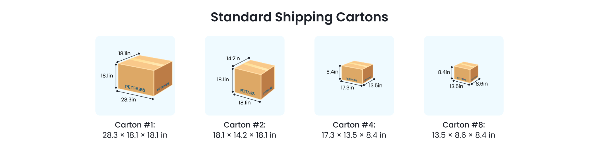 Our commonly used carton sizes are as follows (L × W × H in inches):